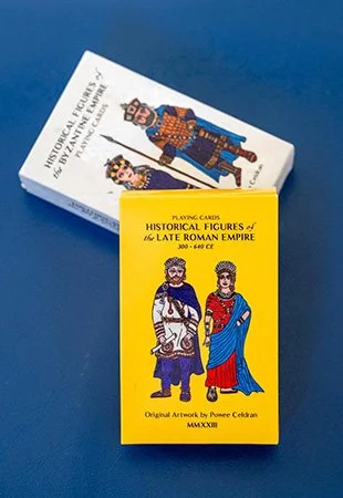 Inspired by the history-themed playing cards he bought as souvenirs Celdran designed his own deck of playing cards. Each card is unique and features his favorite characters and artifacts from the Byzantium. On his webpage, one can find a detailed description, some several pages long, of each character in the second set of cards called “Late Roman.” The backside of his cards show lovely golden mosaic patterns on a blue background, inspired by a visit to the Archbishop's chapel in Ravenna, Italy where he captured the image from the ceiling. His interest in the non-Byzantine also shows in the first set of cards he made. One of the Joker cards is outfitted as a Byzantine-inspired Mandalorian, a shout out to Star Wars fans.