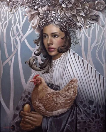Endless Beginning (2014) explores profound existential and cyclical mysteries, defined by Dela Rosa as reflecting: “The classic ‘chicken or egg’ question reflects mystery, cause and effect, and the eternal cycle of life.” The central woman represents the Great Mother archetype, symbolizing the ultimate source of life and the perpetual process of creation and transformation.