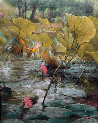 Lotus Pond, 2025, oil on canvas, 30 inches x 24 inches (Photo courtesy of Camille Dela Rosa)