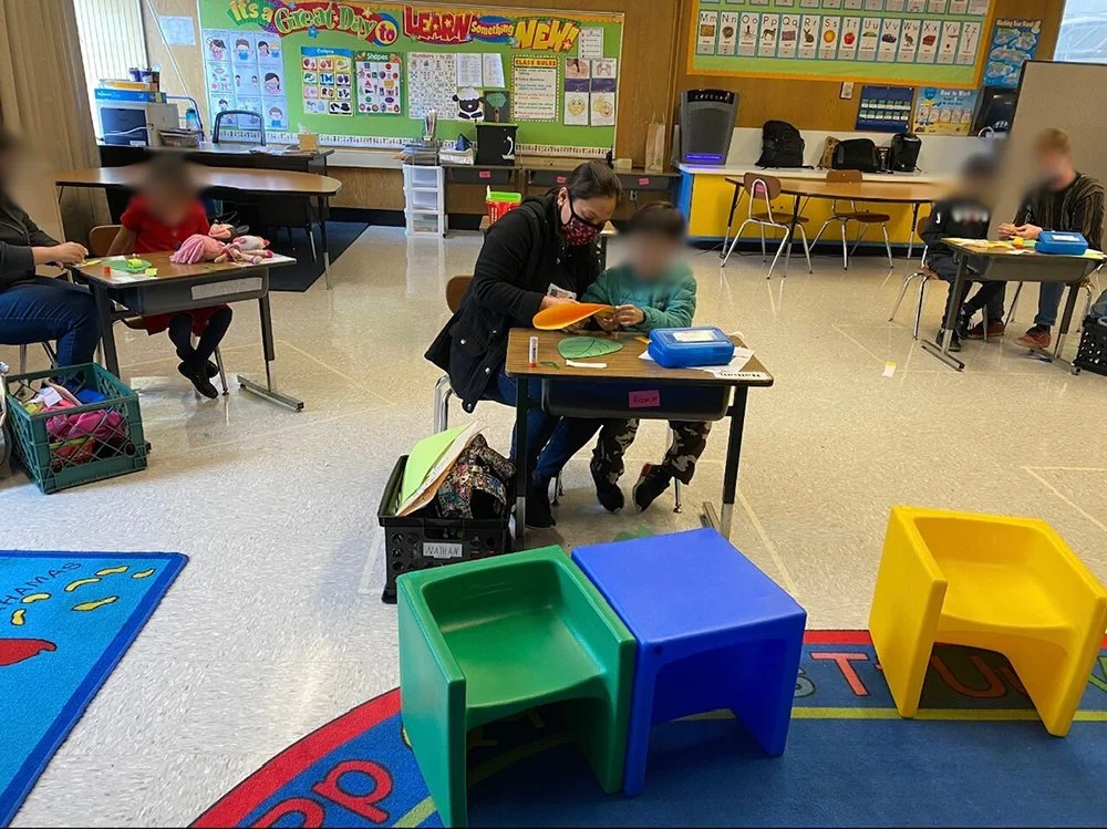 ) Teacher Joyce with her students at M.P. Brown Elementary School in Daly City doing task folders and other activities to develop their skills in 2021-2022.