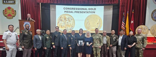 At a separate event at the Post Theatre the day before the march, FilVetREP presented the Congressional Gold Medal to the families of Private First Class Valentino Juanitas of the Philippine Scouts, Chief Petty Officer Leon San Juan Anterola of the U.S. Navy, and Private First Class Conrado V. Castroverde of Company H, 5th Infantry Regiment, Philippine Scouts.